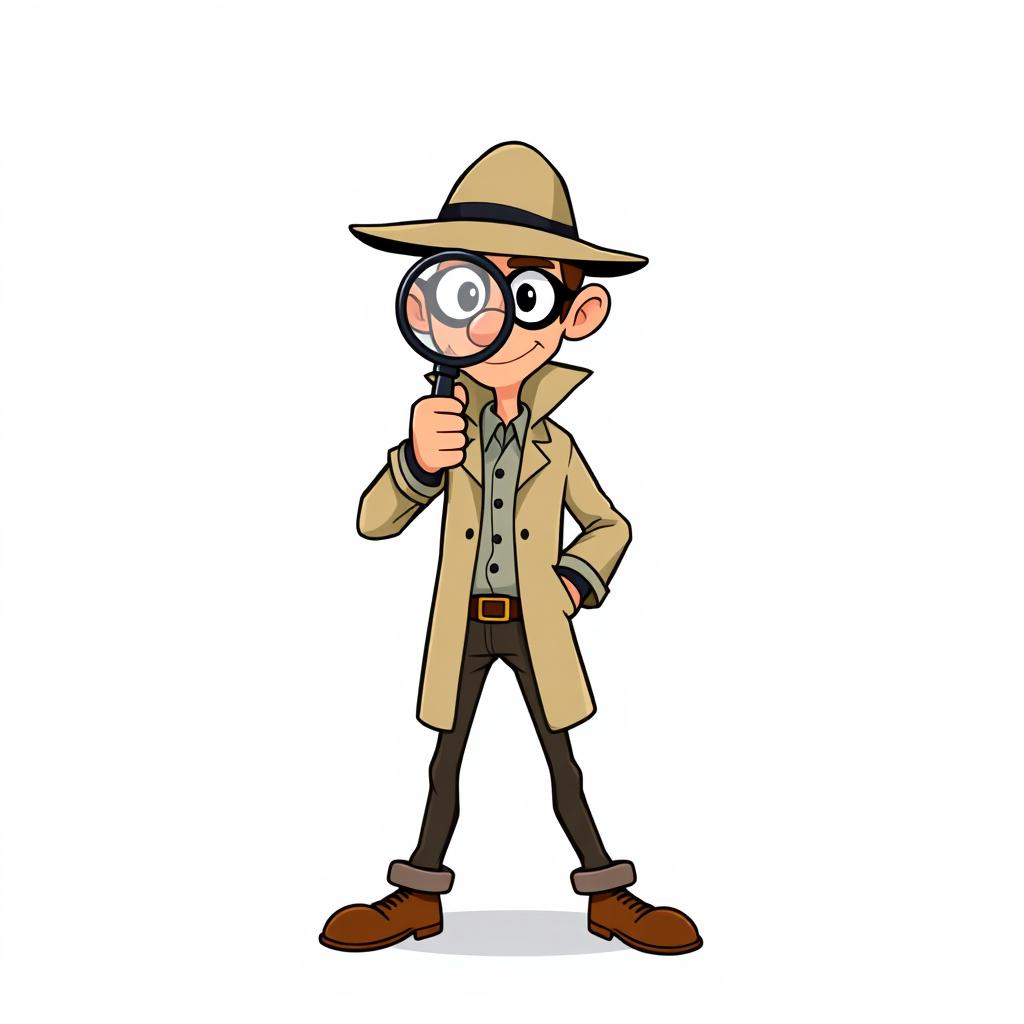 A cartoon detective wearing a hat and glasses looks through a magnifying glass with a serious expression.