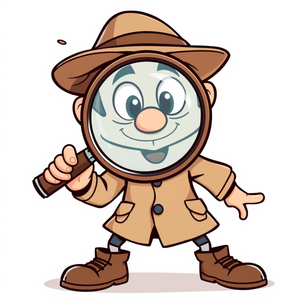 A cartoon detective wearing a brown hat and coat is holding a magnifying glass in front of his face and looking through it.