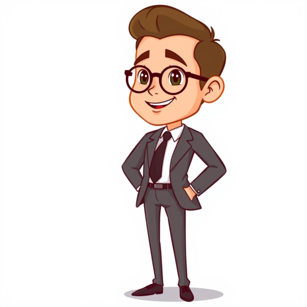 A cartoon illustration of a businessman in a suit, white shirt, and tie smiling with hands on his hips.