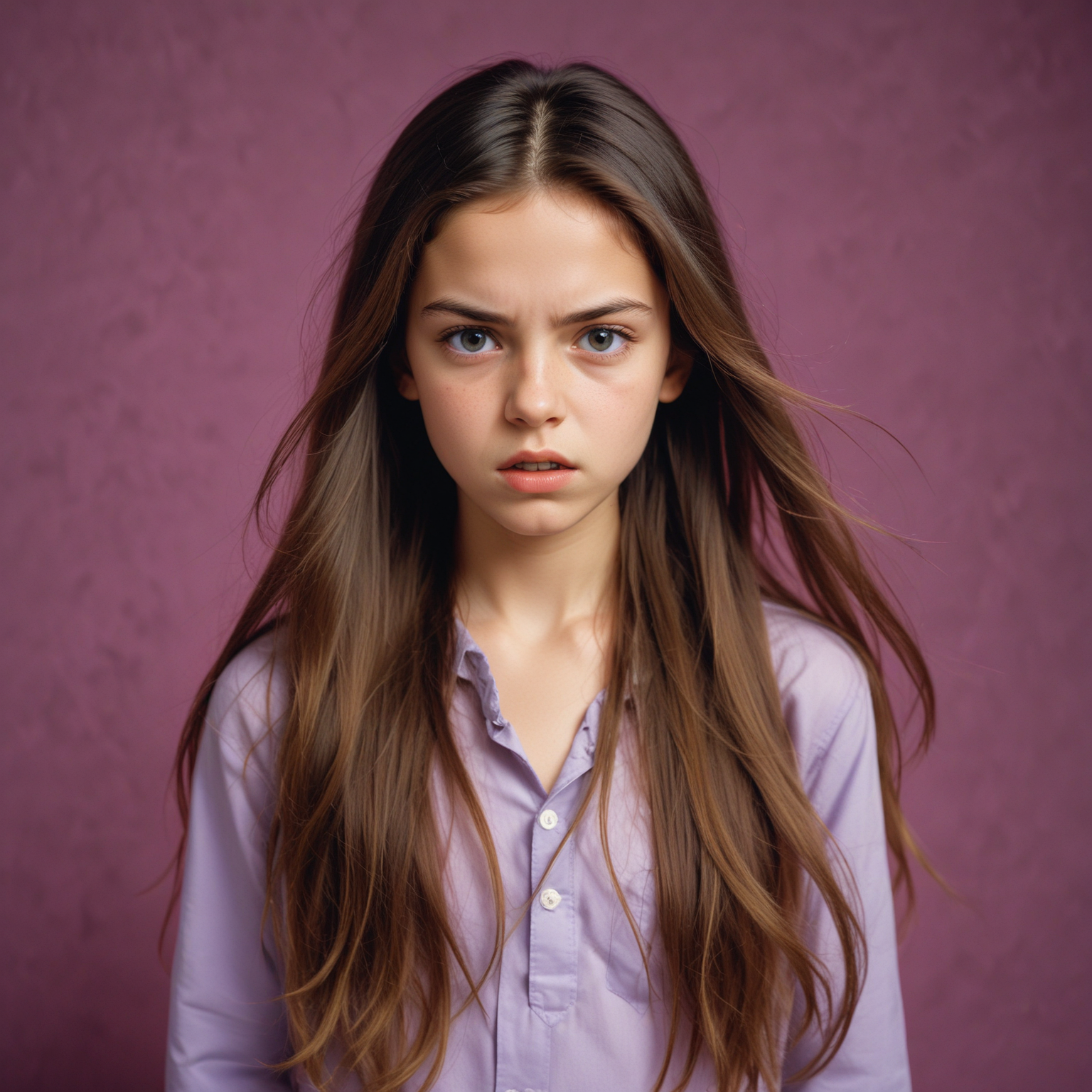 blue, brown, button-down, expression, eyes, face, female, girl, hair, intense, light, long, look, portrait, purple, serious, shirt, stare, woman, young
