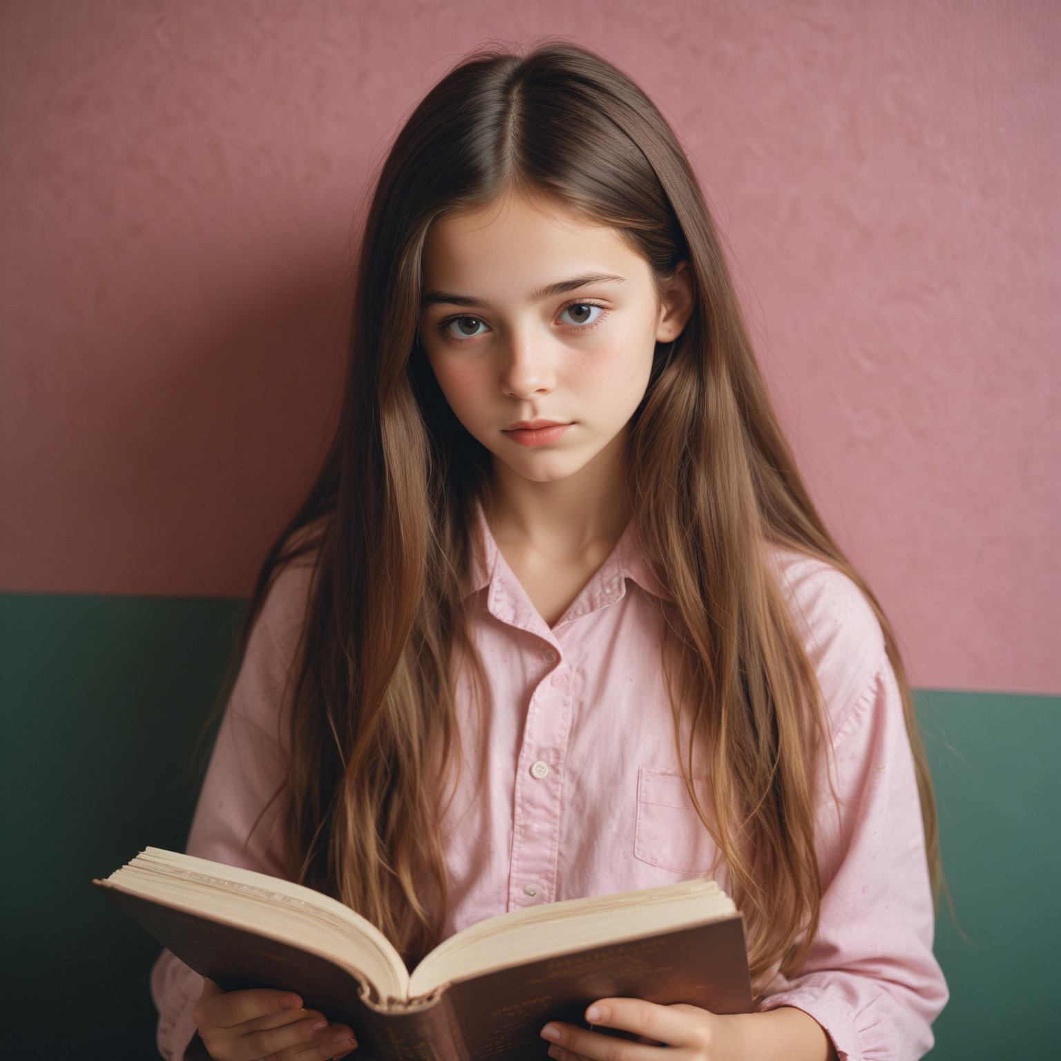 A young girl with long brown hair wears a pink button-up shirt and holds an open brown book in front of her. She gazes forward with a thoughtful expression against a pink and green textured wall. Her hair falls over her shoulders as she sits or stands isolated on the solid background.