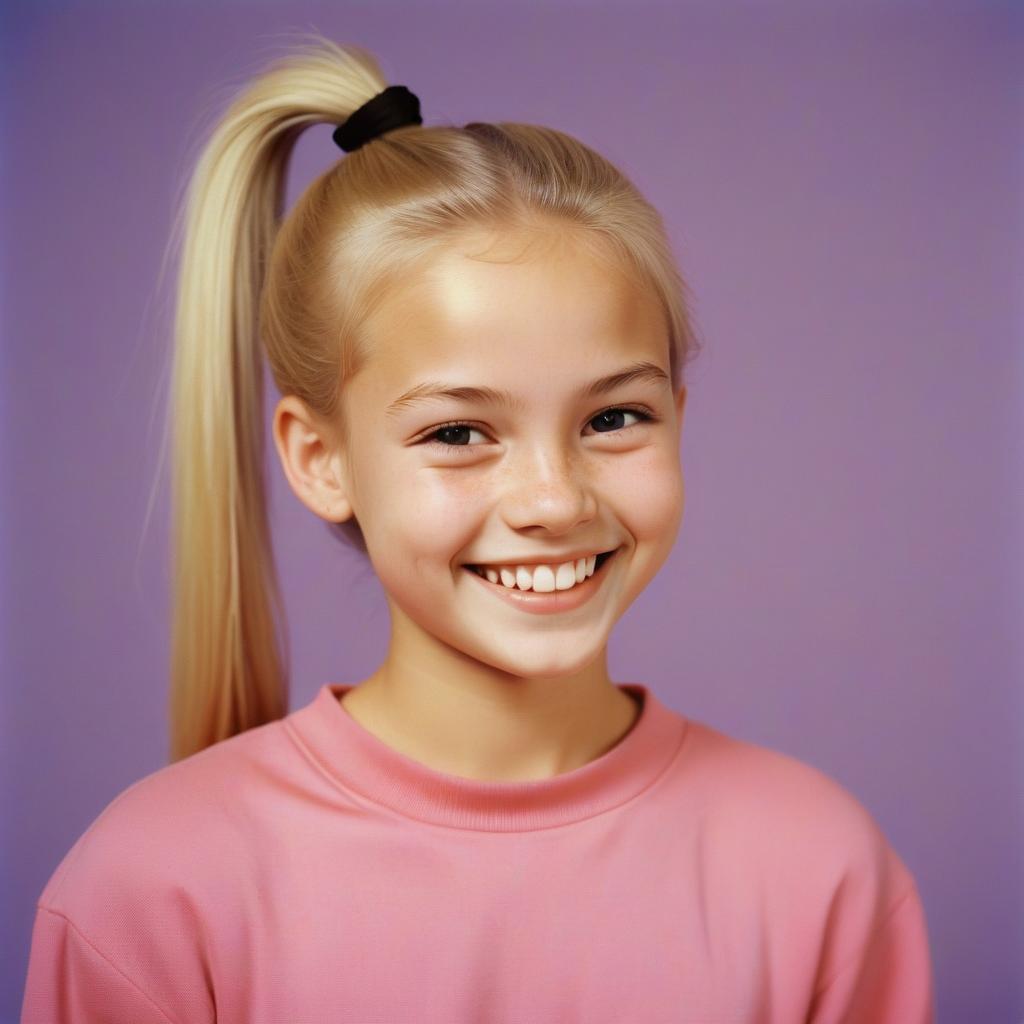 background, beauty, blonde, child, expression, fashion, female, girl, hair, happy, model, pink, ponytail, portrait, purple, shirt, smile, studio, teeth, young