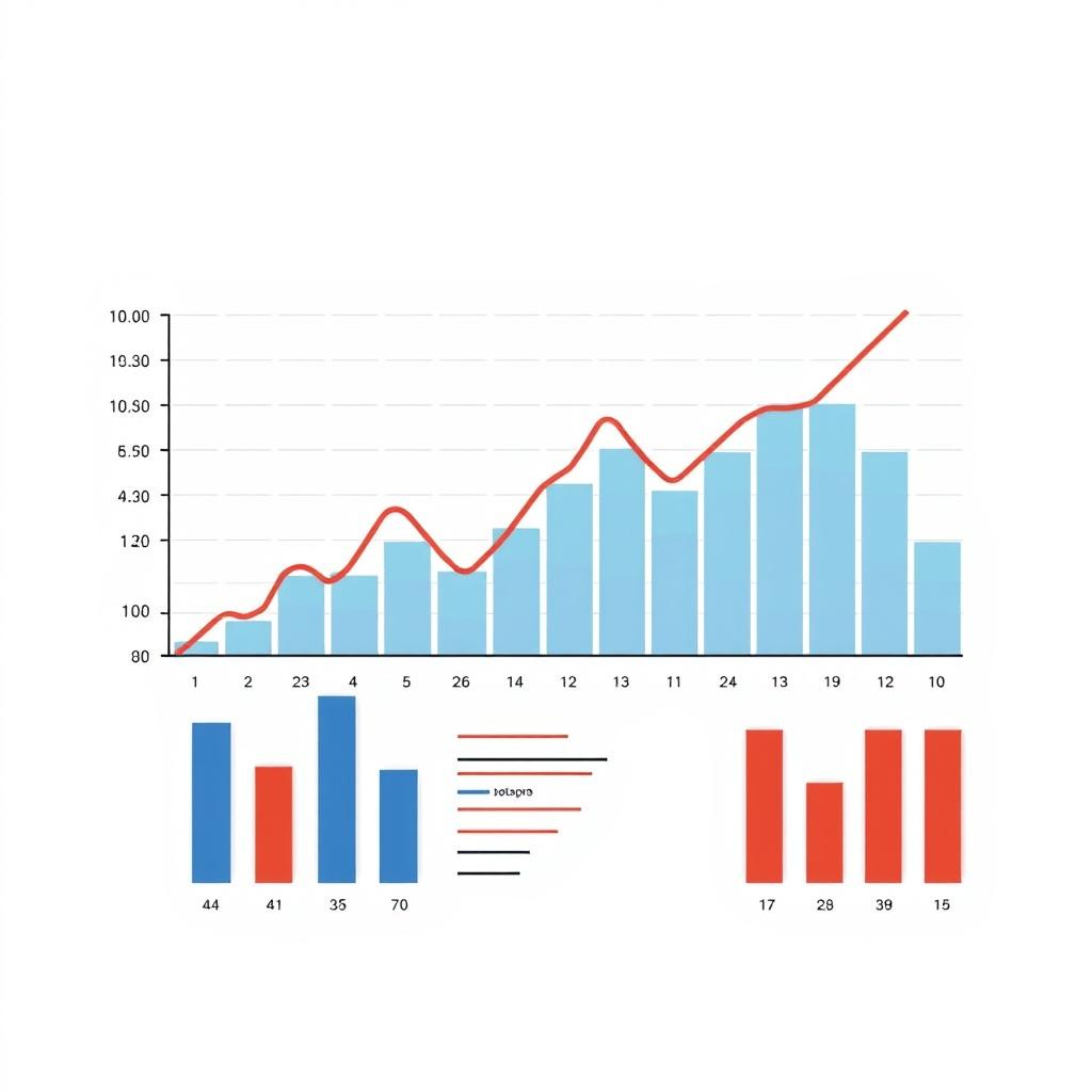 A bar graph with blue and red bars shows data values for different periods. A red line shows a trend over time.