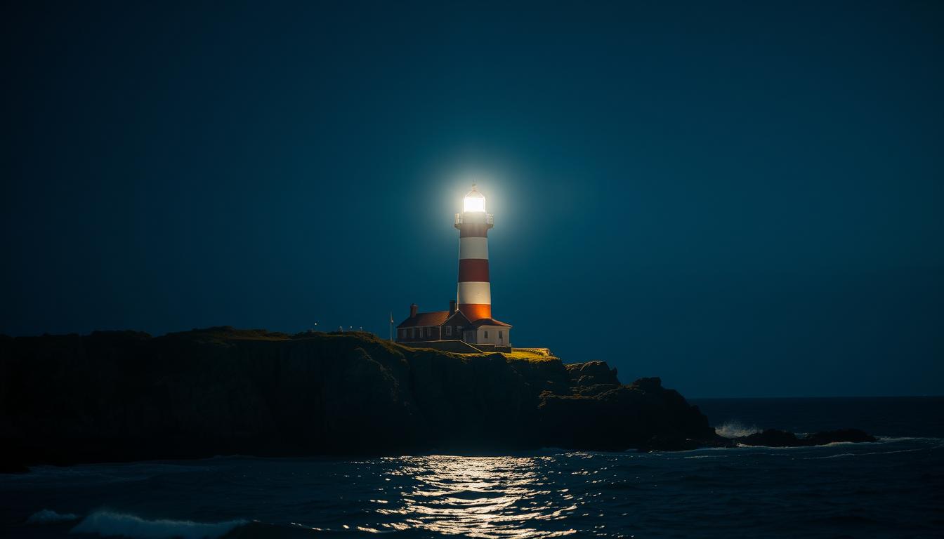 A lighthouse shines its light on a dark night