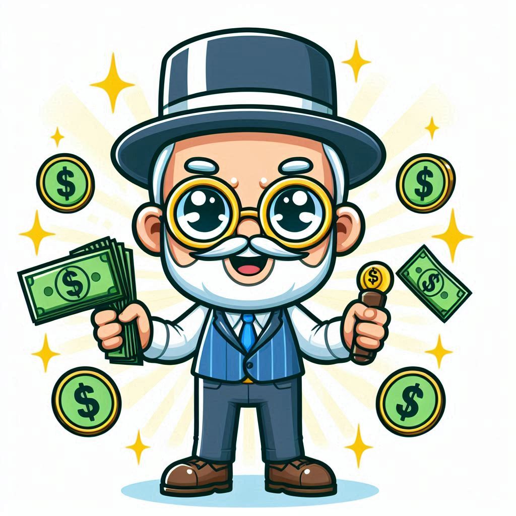 A cartoon man with a white beard and top hat smiles, holding money and a cane, as cash falls from the sky around him