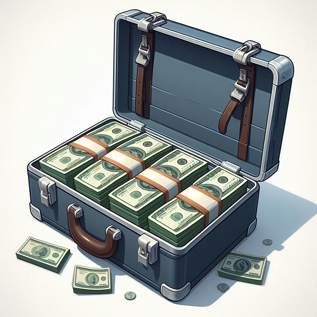 A gray suitcase is open, filled with banded stacks of cash, scattered loose bills, and coins around it