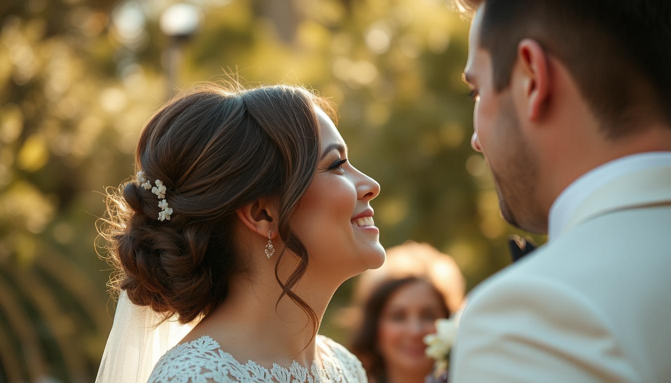 Smiling bride in lace wedding gown