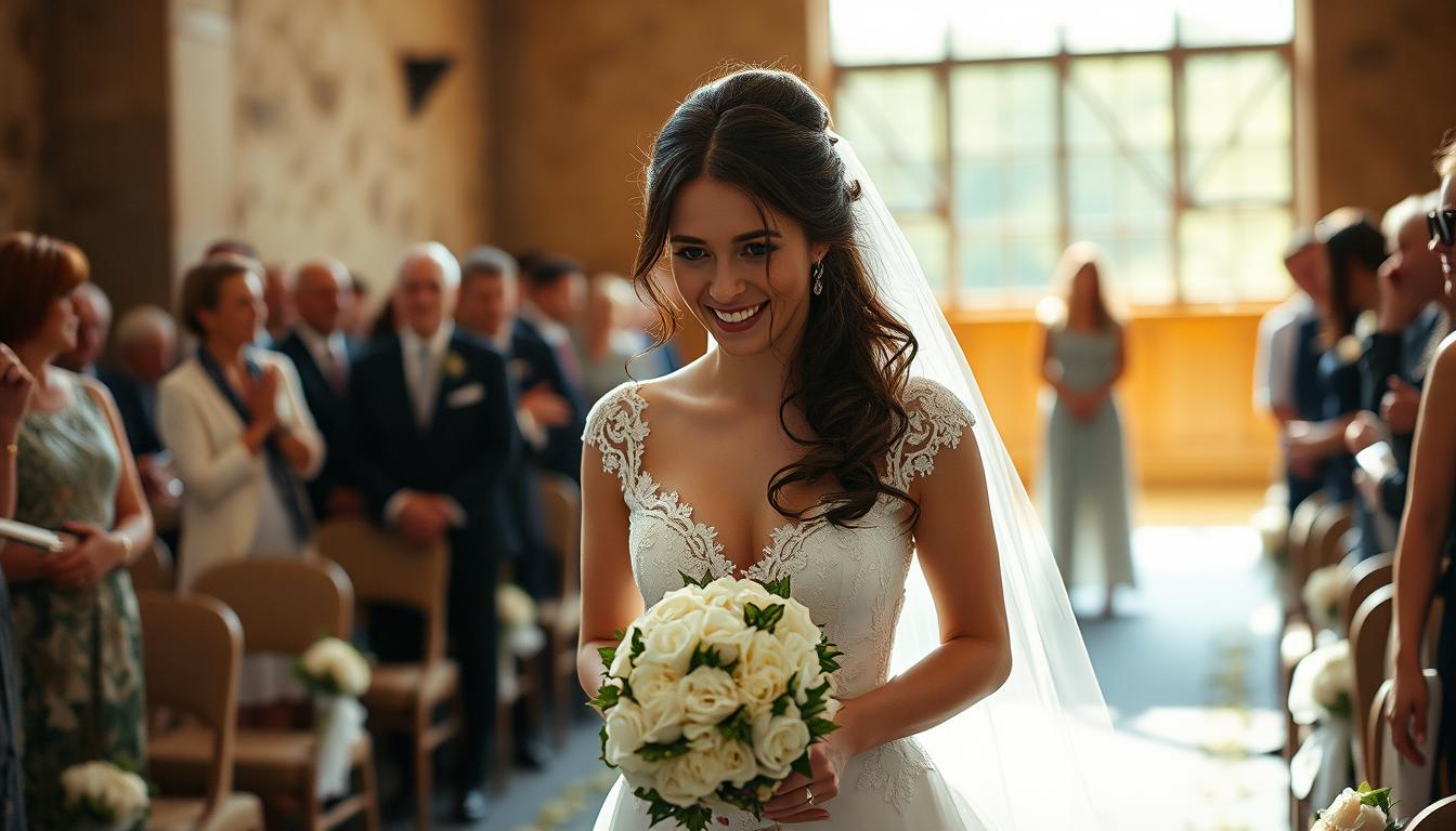 A bride in a white lace dress walks down the aisle, carrying a bouquet of white roses, as guests watch.