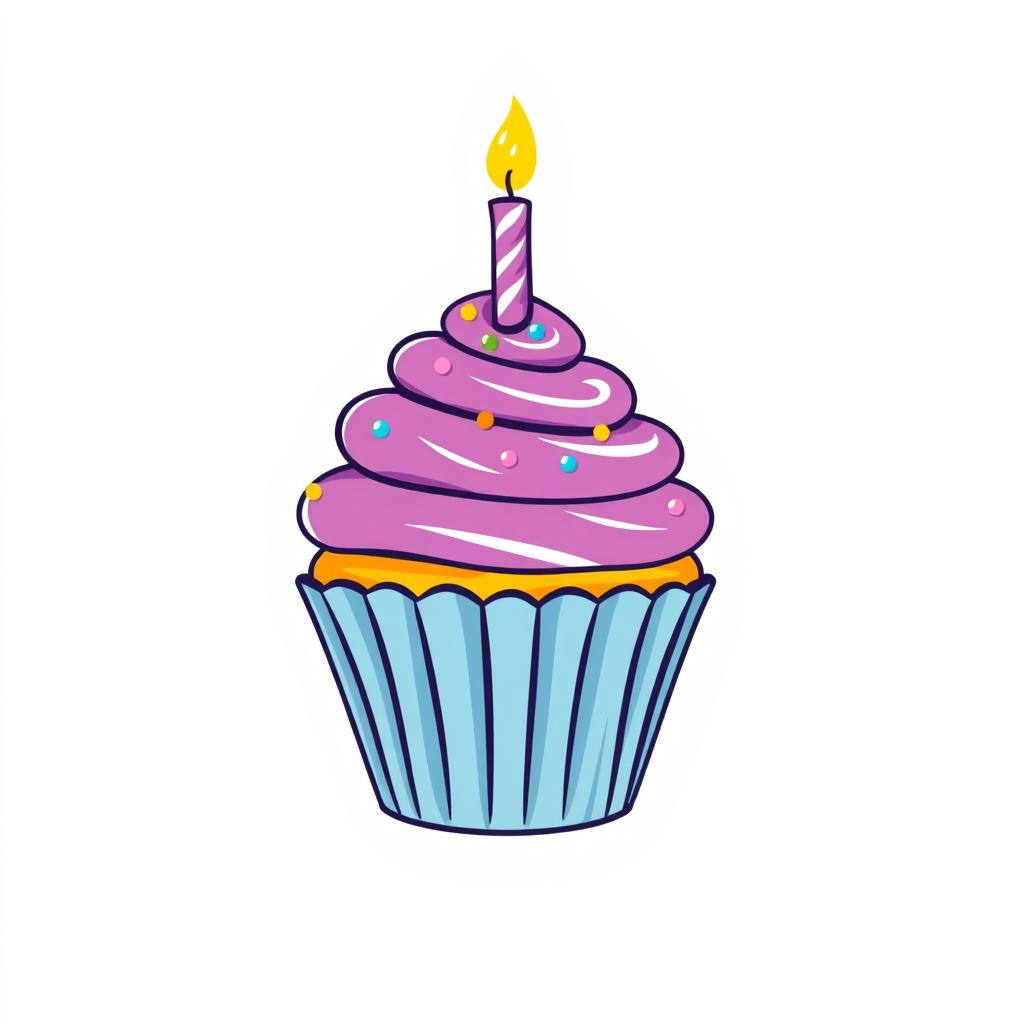 A cartoon illustration of a purple cupcake with white swirls, colorful sprinkles, and a lit candle on top.