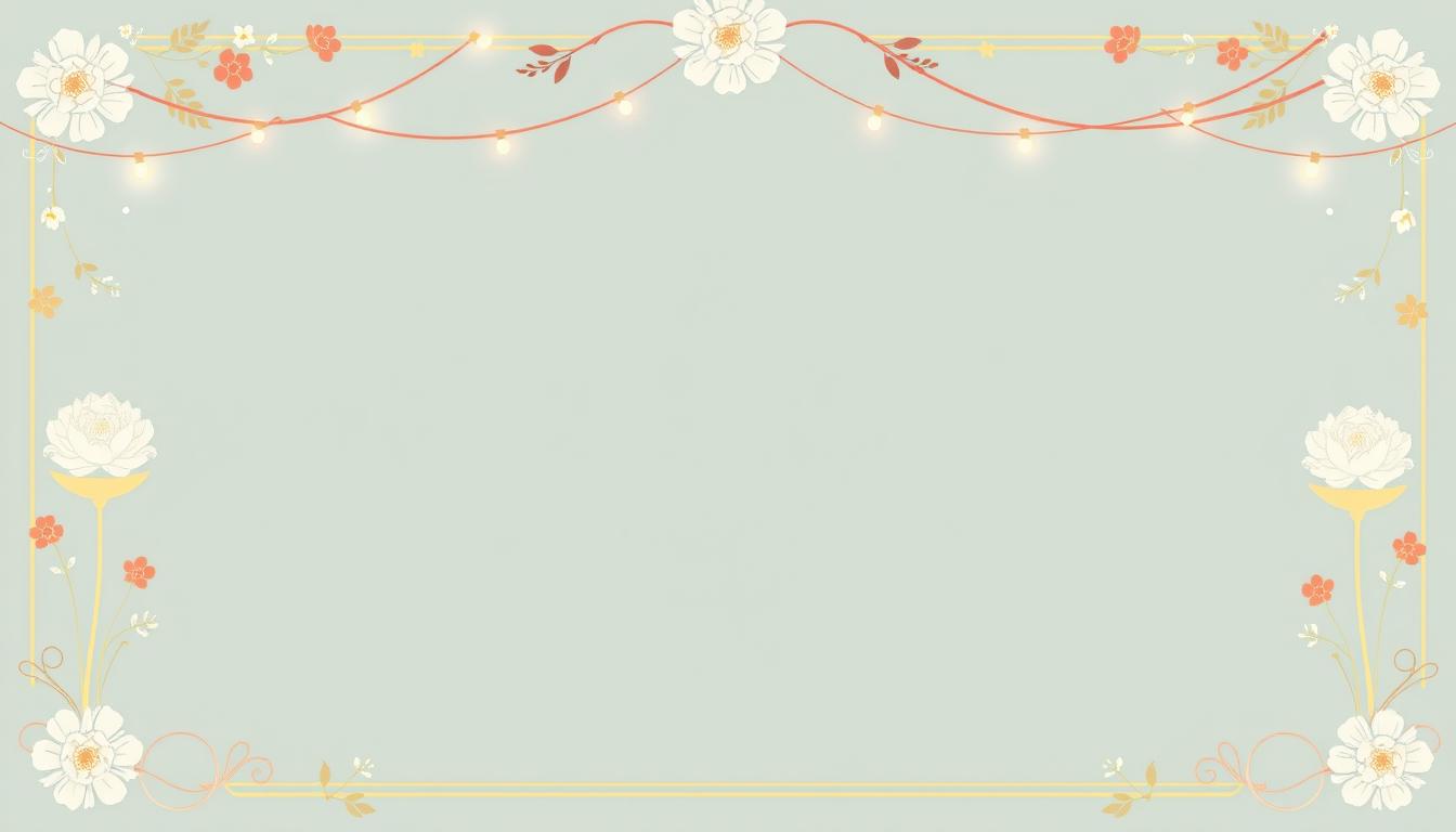 A light blue background with a white floral border and string lights.