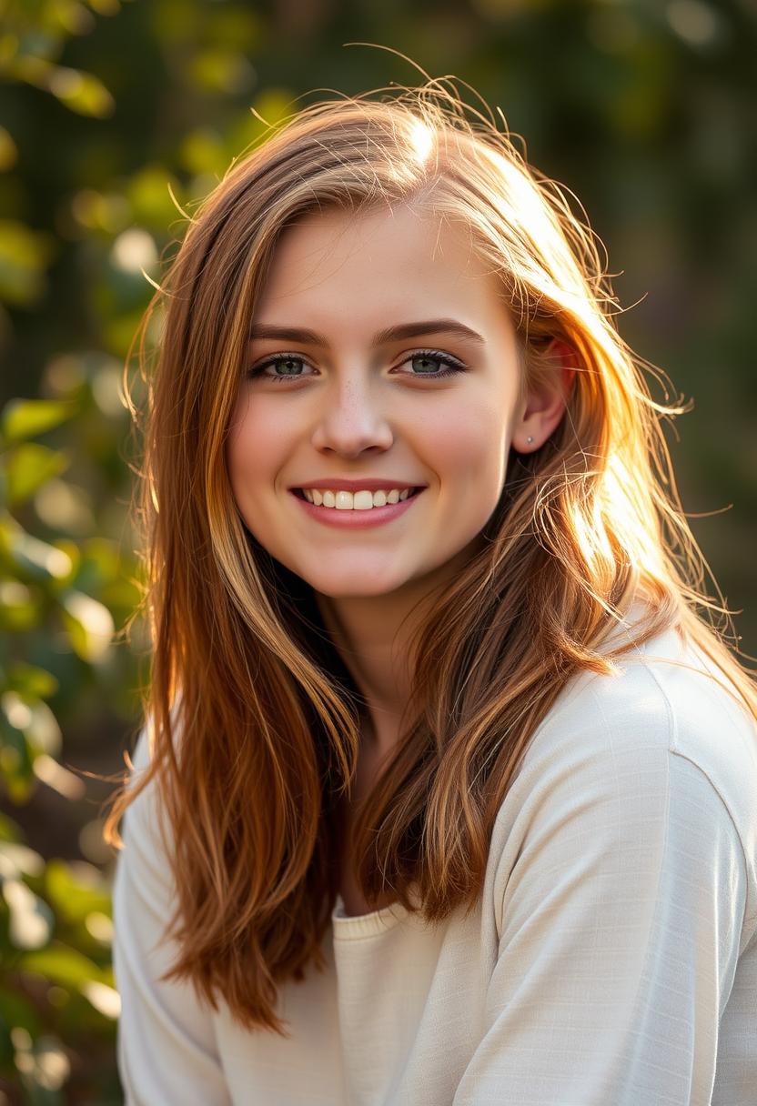 A young woman with long, light brown hair smiles at the camera in a forest with green foliage behind her.