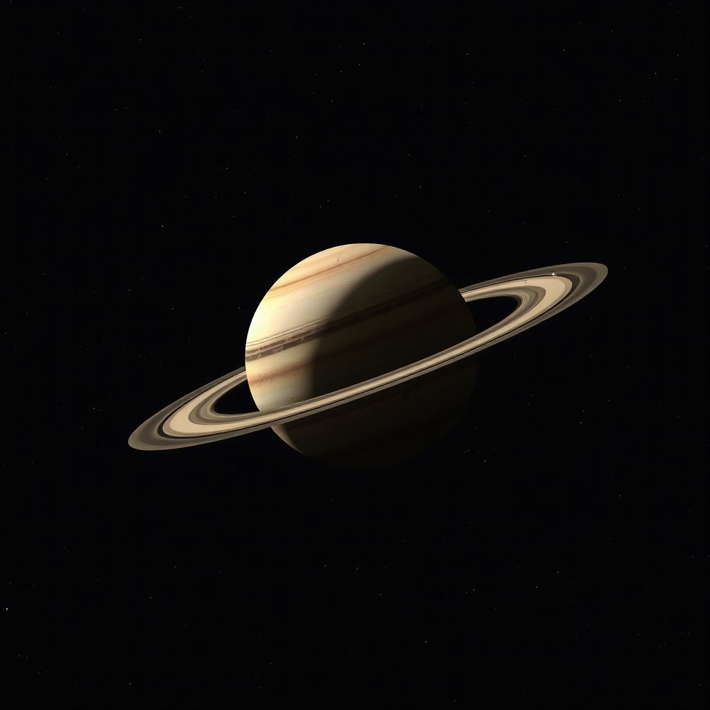 A close-up of the planet Saturn with its iconic ring system against a black background.