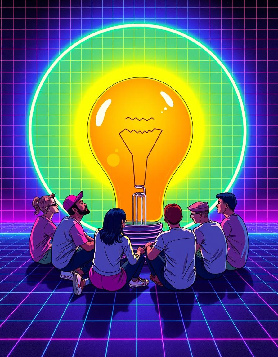 Six people sit in a circle looking up at a large glowing lightbulb in a neon ring.