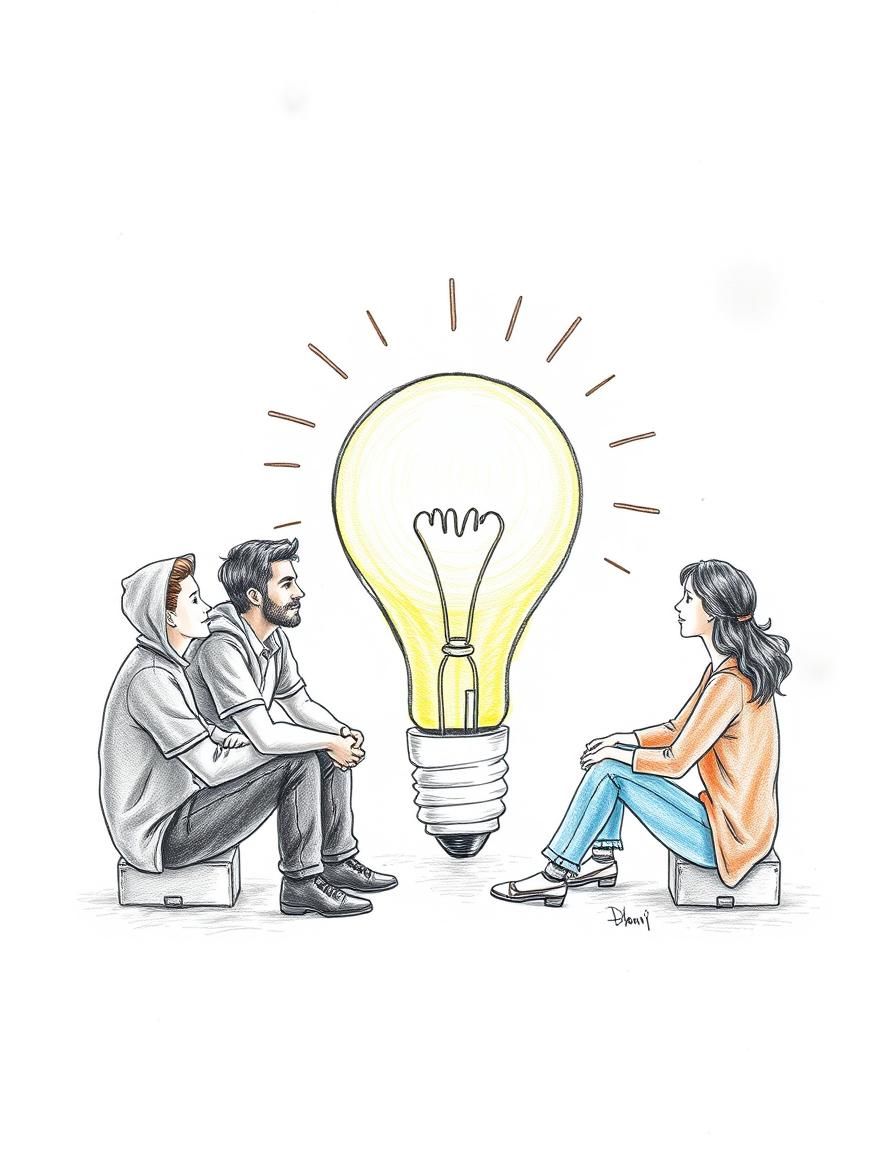 Three individuals are seated on boxes, facing a large light bulb, suggesting a collaborative brainstorming session.