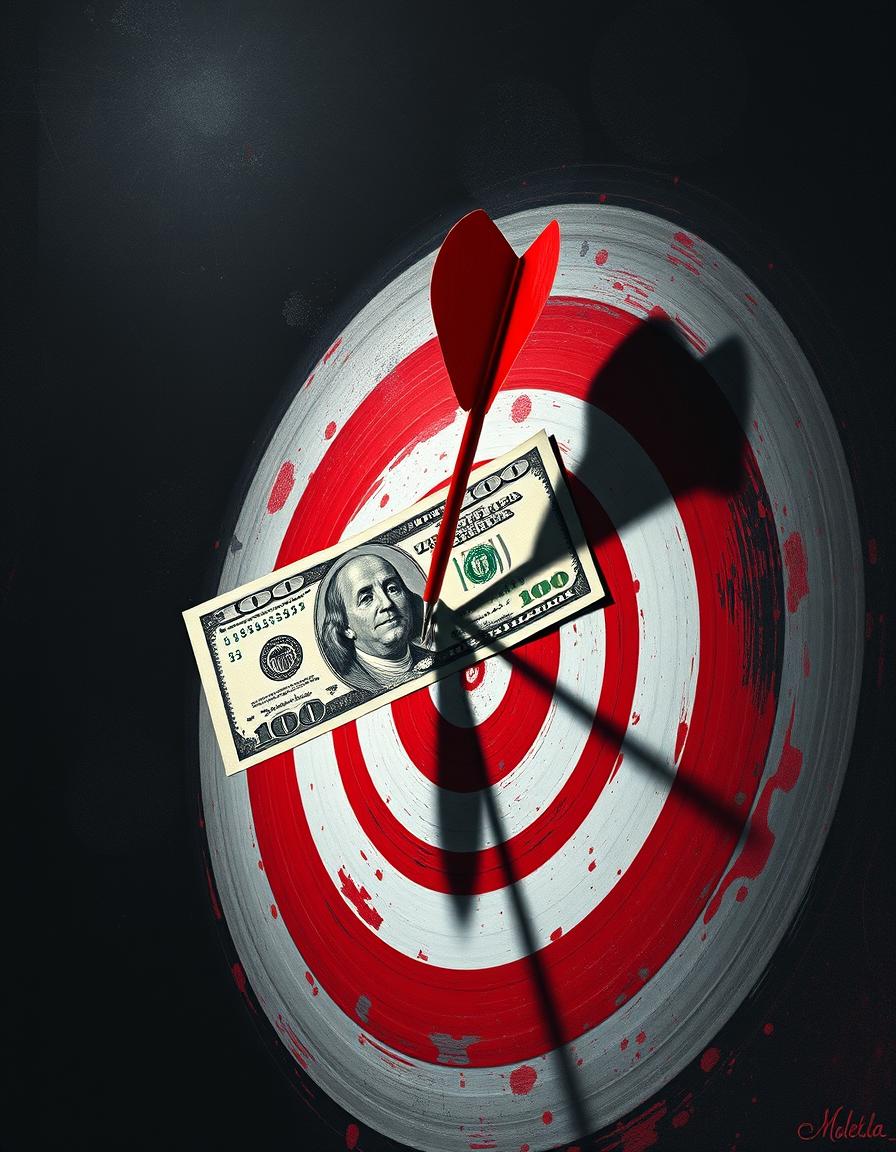 A red dart has pierced a $100 bill that is positioned in the center of a red and white bullseye target.