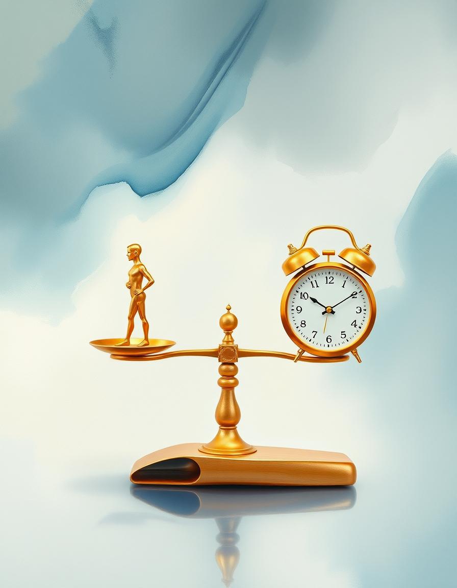 A balanced gold scale shows a small gold figure on one side and a gold clock on the other, set against a pale blue background