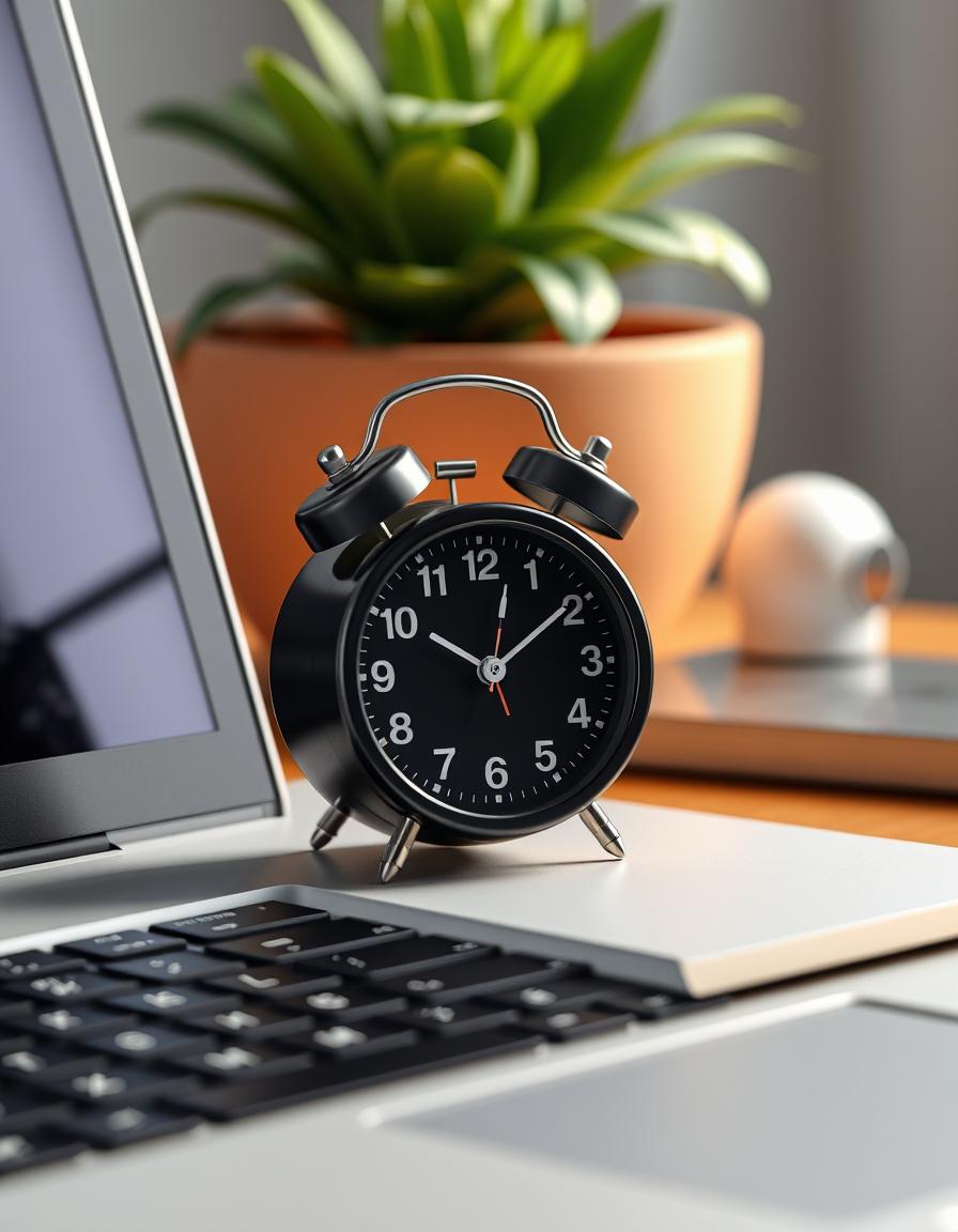 alarm, black, business, clock, desk, hands, home, keyboard, laptop, management, numbers, office, plant, potted, productivity, technology, time, white, work, workday