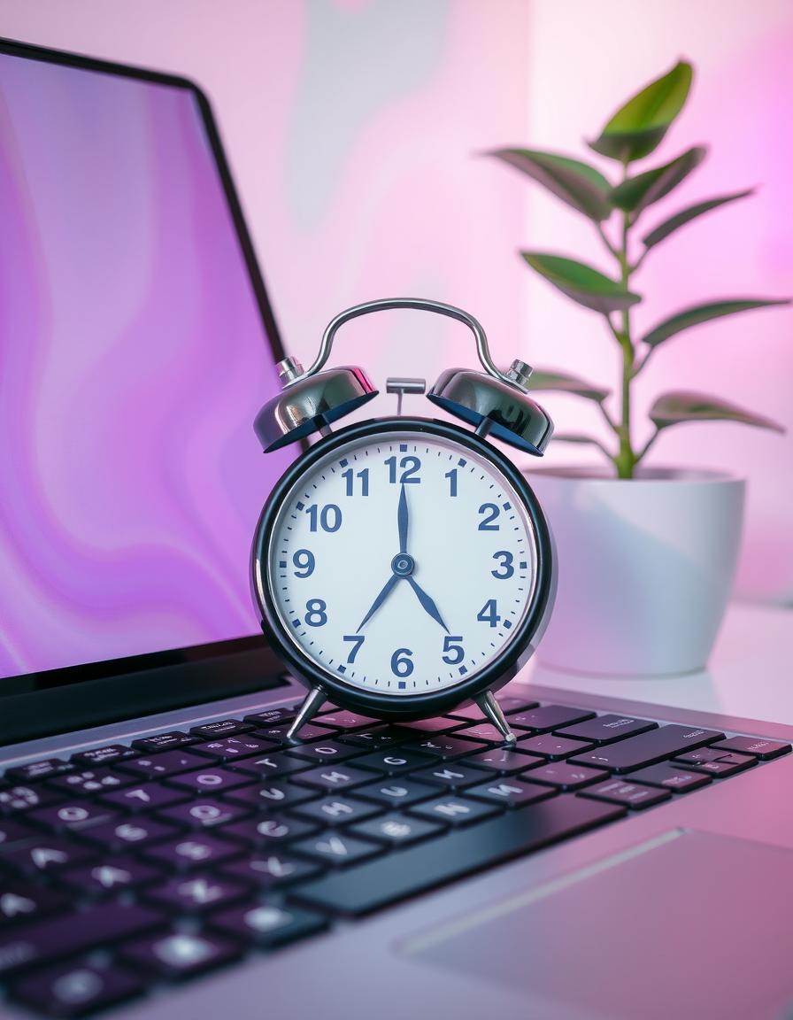 alarm, business, clock, computer, deadline, desk, gadget, green, houseplant, keyboard, laptop, management, office, pink, plant, productivity, schedule, technology, time, work