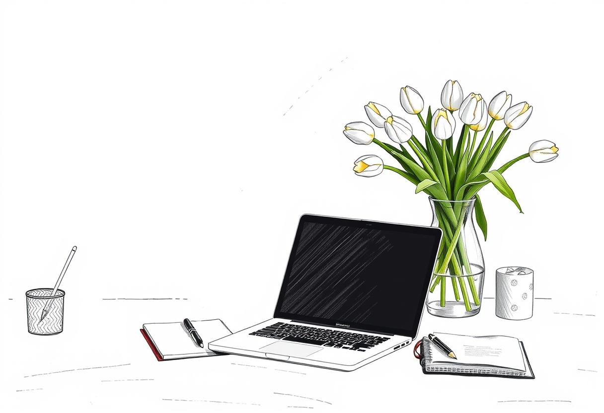 A sketch of a white laptop, a notebook with a pen, and a vase of white tulips on a table. A pencil sits in a cup beside the laptop.