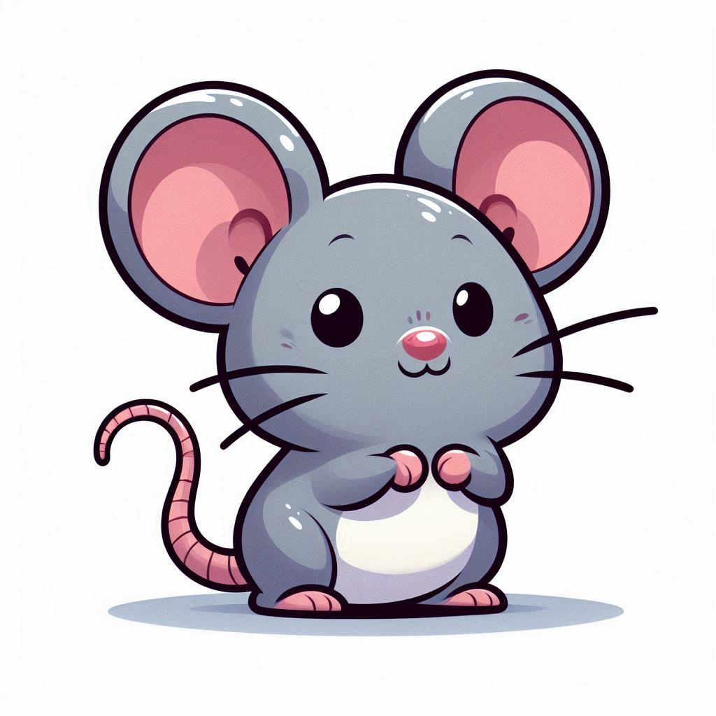 A standing cartoon mouse with a gray body, white belly, large pink ears, and a pink nose has its paws together