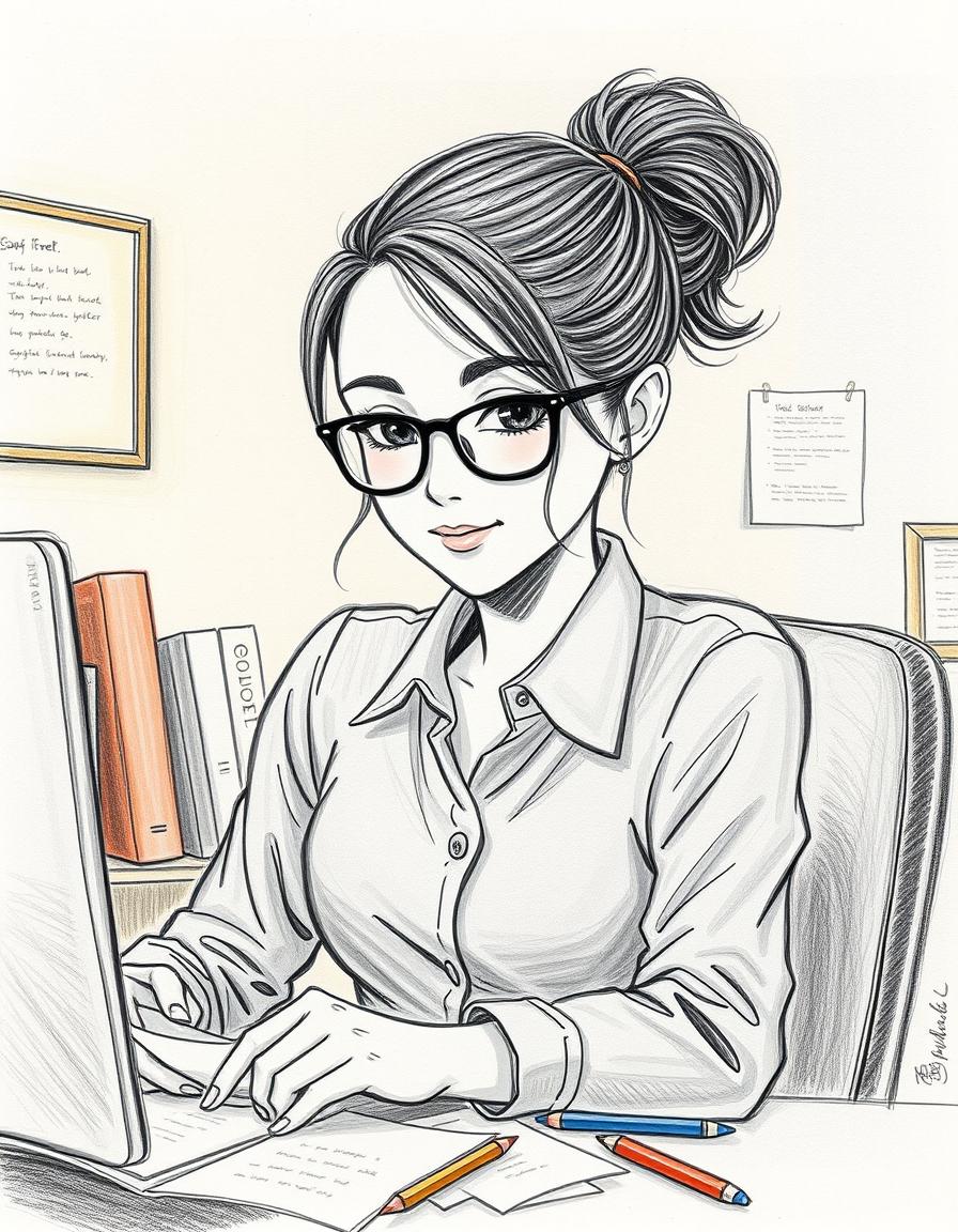 bun, business, computer, concentration, desk, employee, female, glasses, hair, keyboard, laptop, office, papers, pencils, professional, sitting, typing, woman, work, working