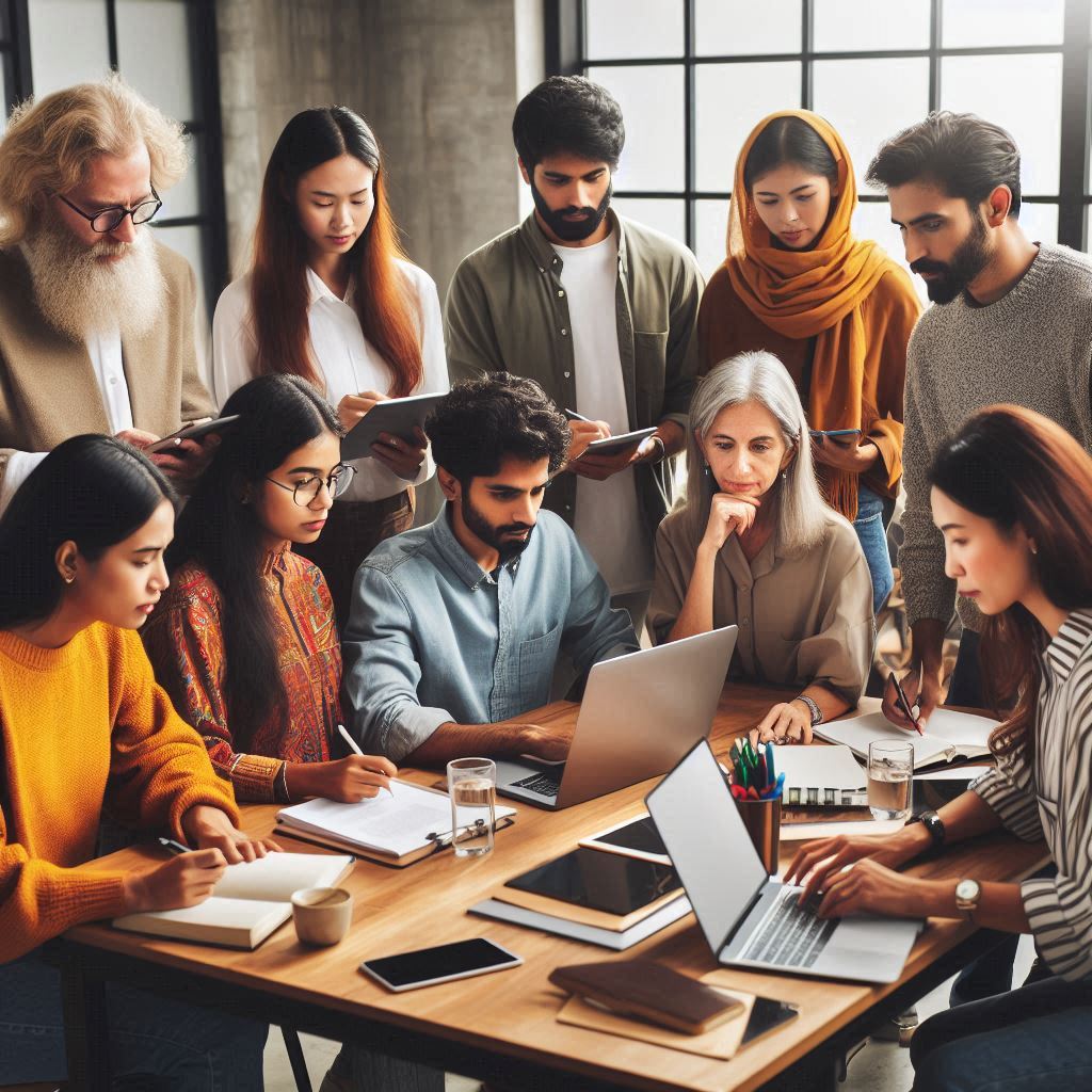 A diverse group of men and women of various ages and races is gathered around a table, working on laptops and writing notes