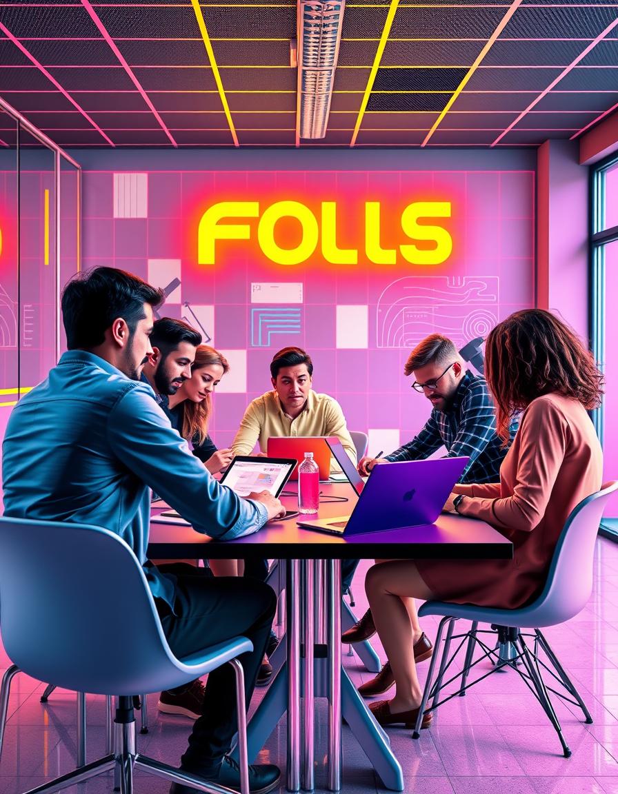 A group of people are seated around a table in an office, working on laptops. They are surrounded by pink walls and a neon sign that reads Folls.
