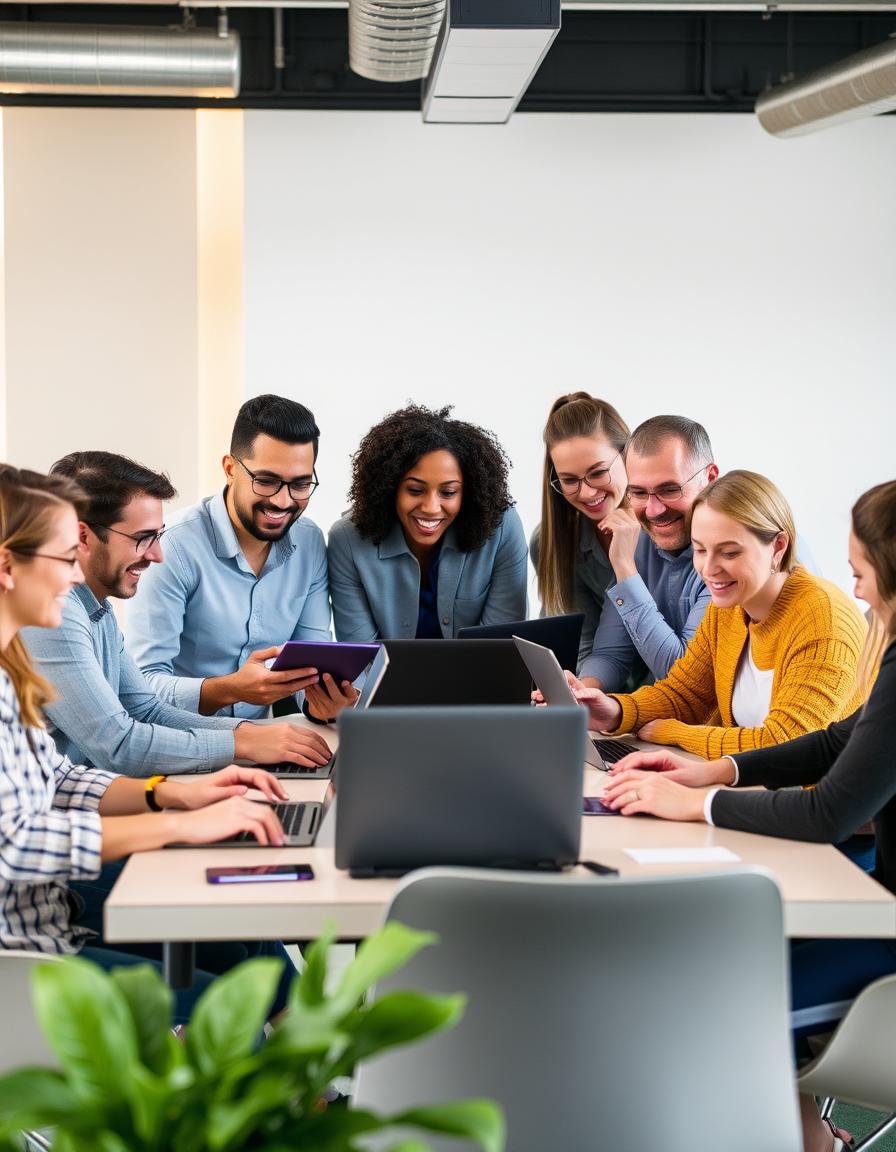 A diverse group collaborates on laptops in a modern office, discussing and smiling while focused on their screens