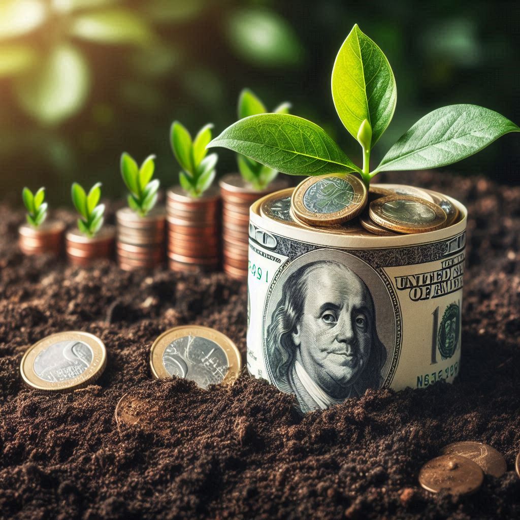 background, bill, business, coins, currency, dollar, economy, finance, financial, green, growth, investment, market, money, plant, rolled, sprout, stack, success, wealth