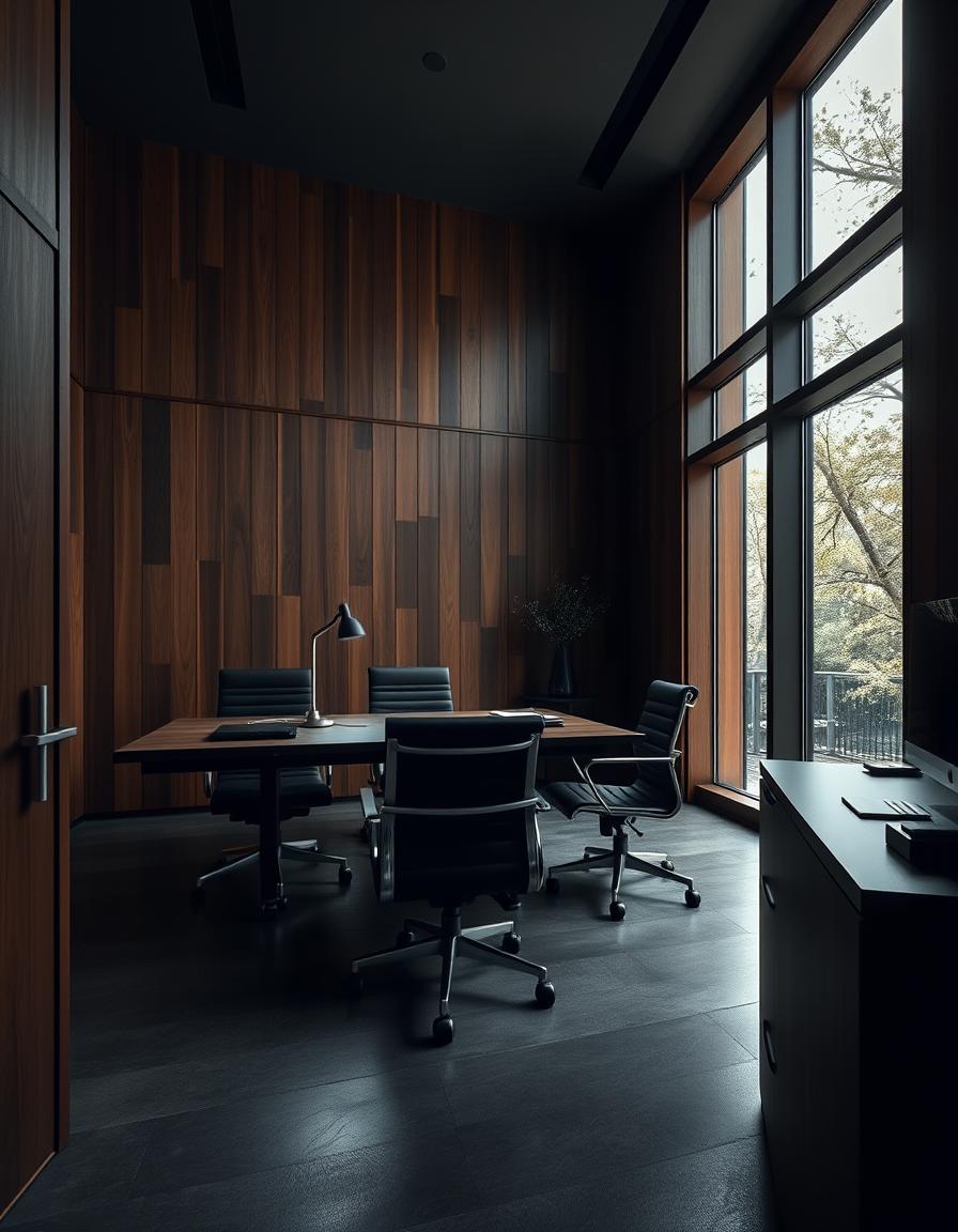 A dark, modern office space with a large window, a wooden wall, a desk with four black office chairs, and a lamp.