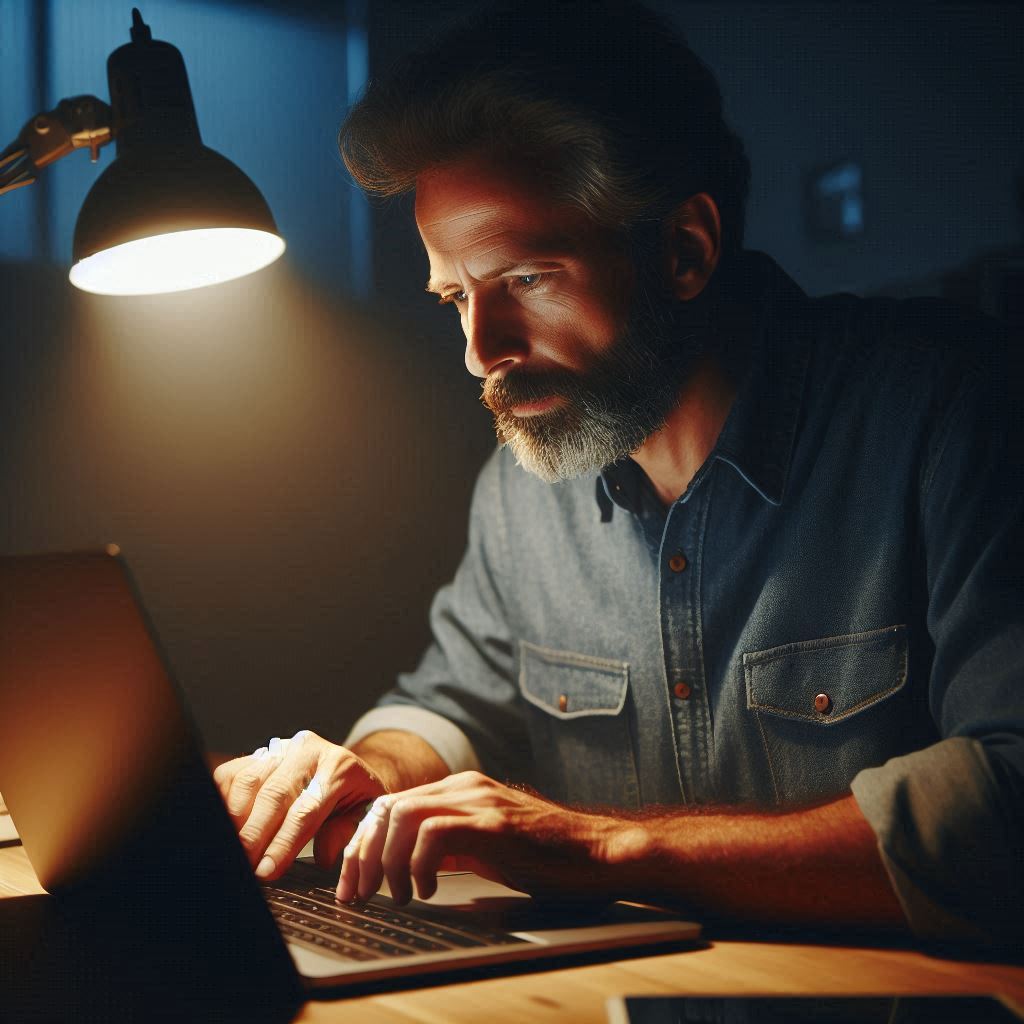 A man with a beard is sitting at a desk, typing on a laptop illuminated by a desk lamp.