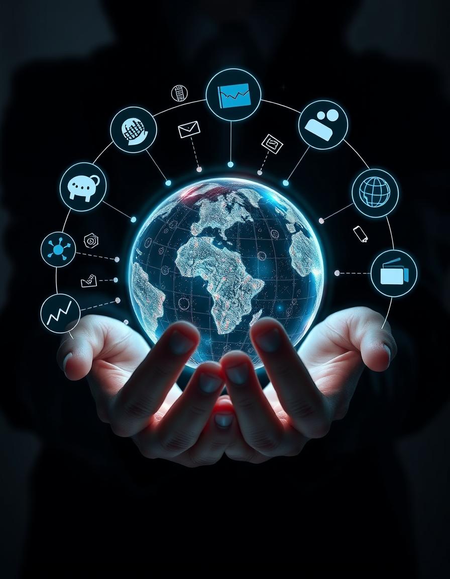 A pair of hands hold a glowing, blue digital globe surrounded by several icons representing online activity.
