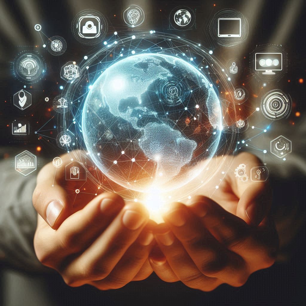 A pair of hands are holding a glowing digital globe that is surrounded by icons representing technology, data, and the internet.