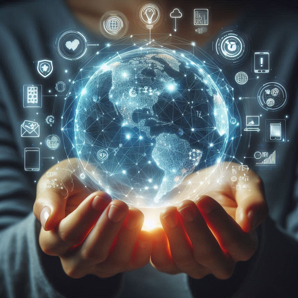 A person's hands hold a glowing, digital representation of the Earth, surrounded by icons representing various technologies and concepts.