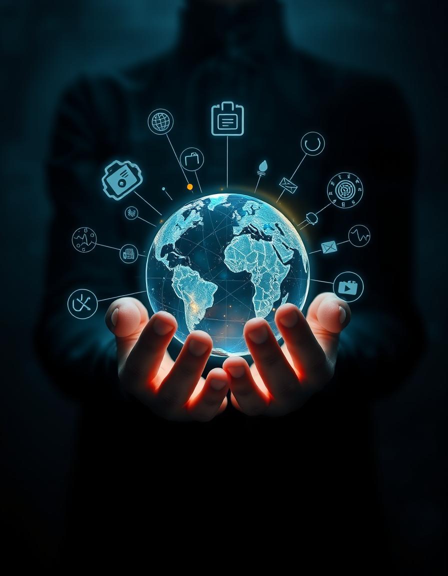A person holds a glowing digital globe, surrounded by icons of technology, communication, and business