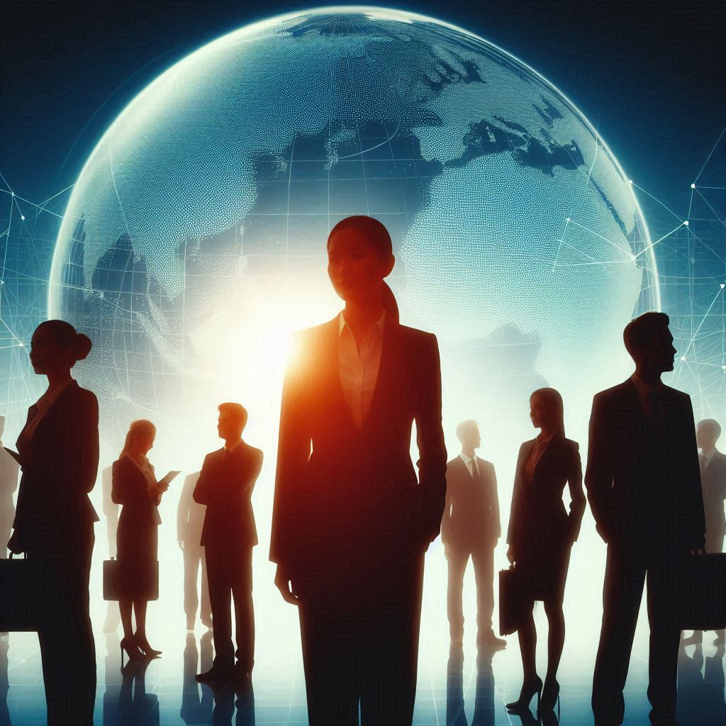 Silhouettes of men and women in business attire stand in front of a glowing Earth.
