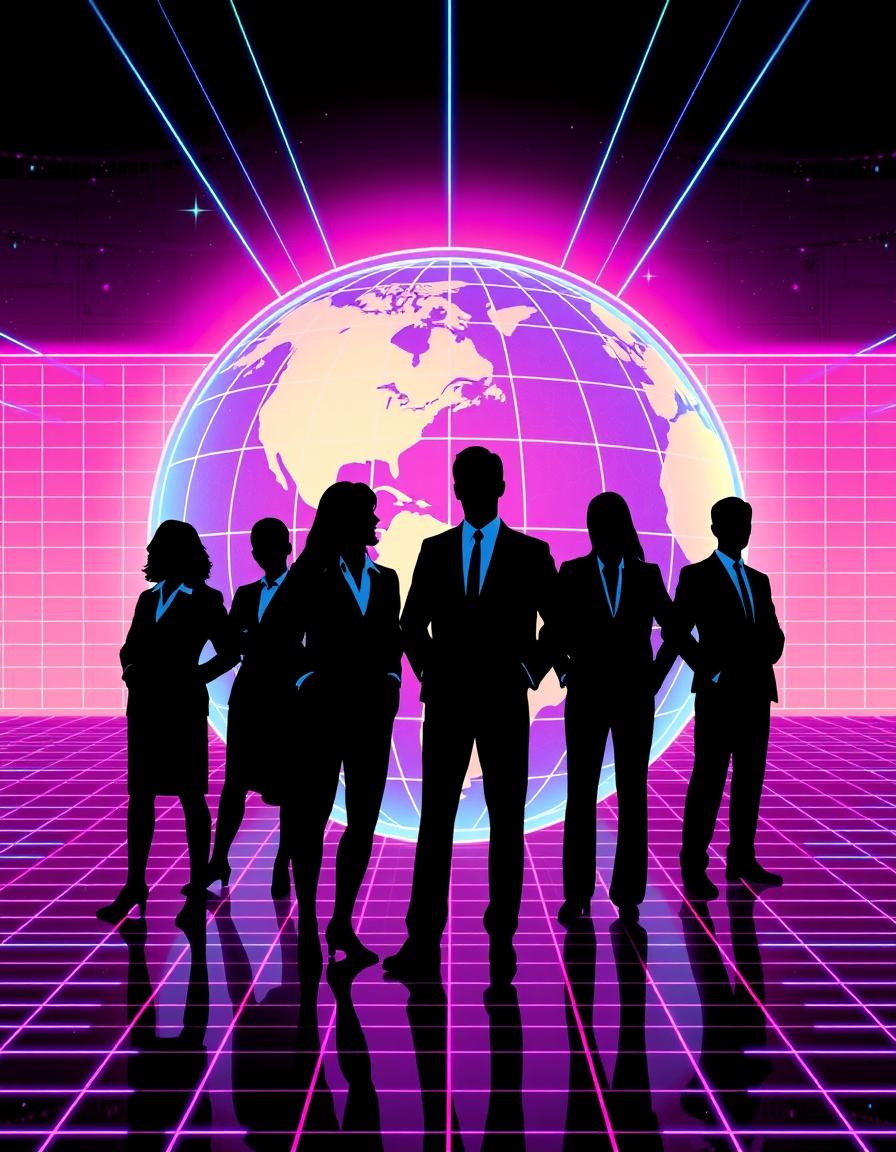 abstract, business, businesspeople, earth, floor, future, futuristic, global, globe, glow, grid, group, light, modern, neon, people, pose, silhouettes, standing, wall
