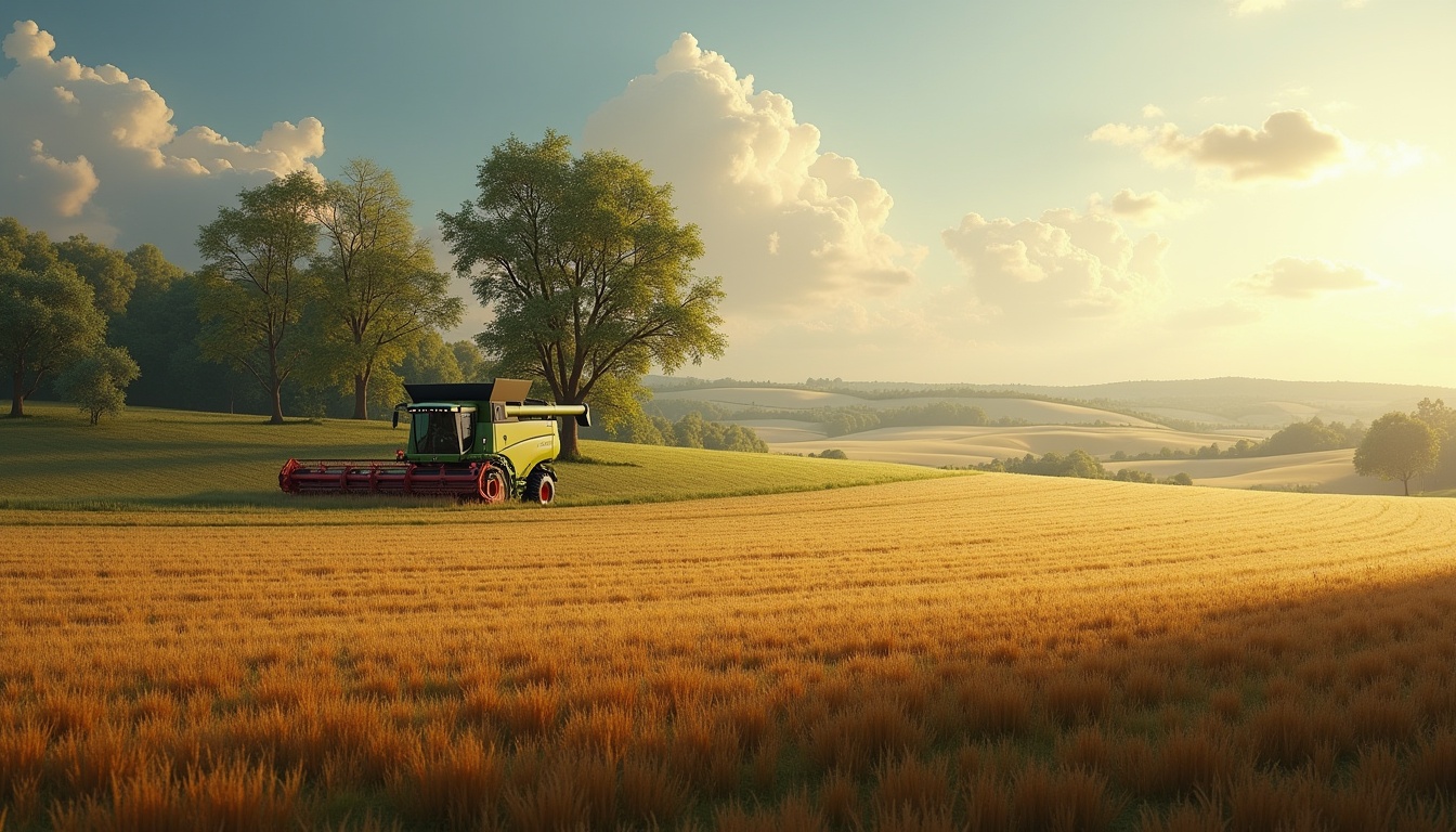 A yellow combine harvester sits in a golden wheat field, with trees and rolling hills under a warm sunset glow