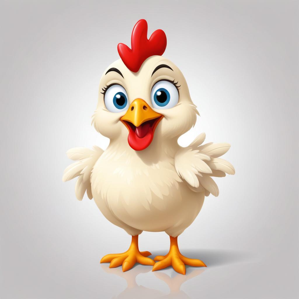 A cartoon chicken smiles against a gray background