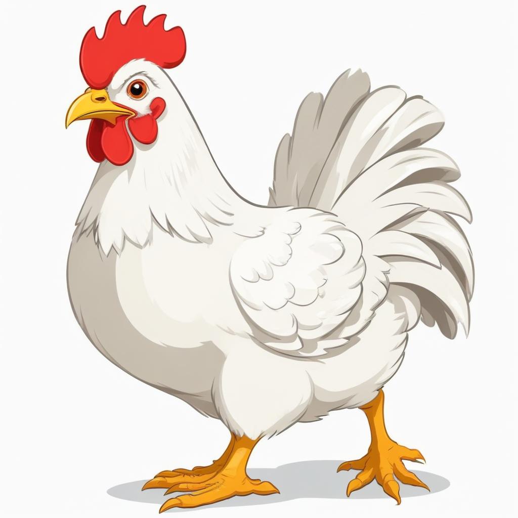 A white chicken with a red comb stands on a white background. The chicken is facing to the right of the image.