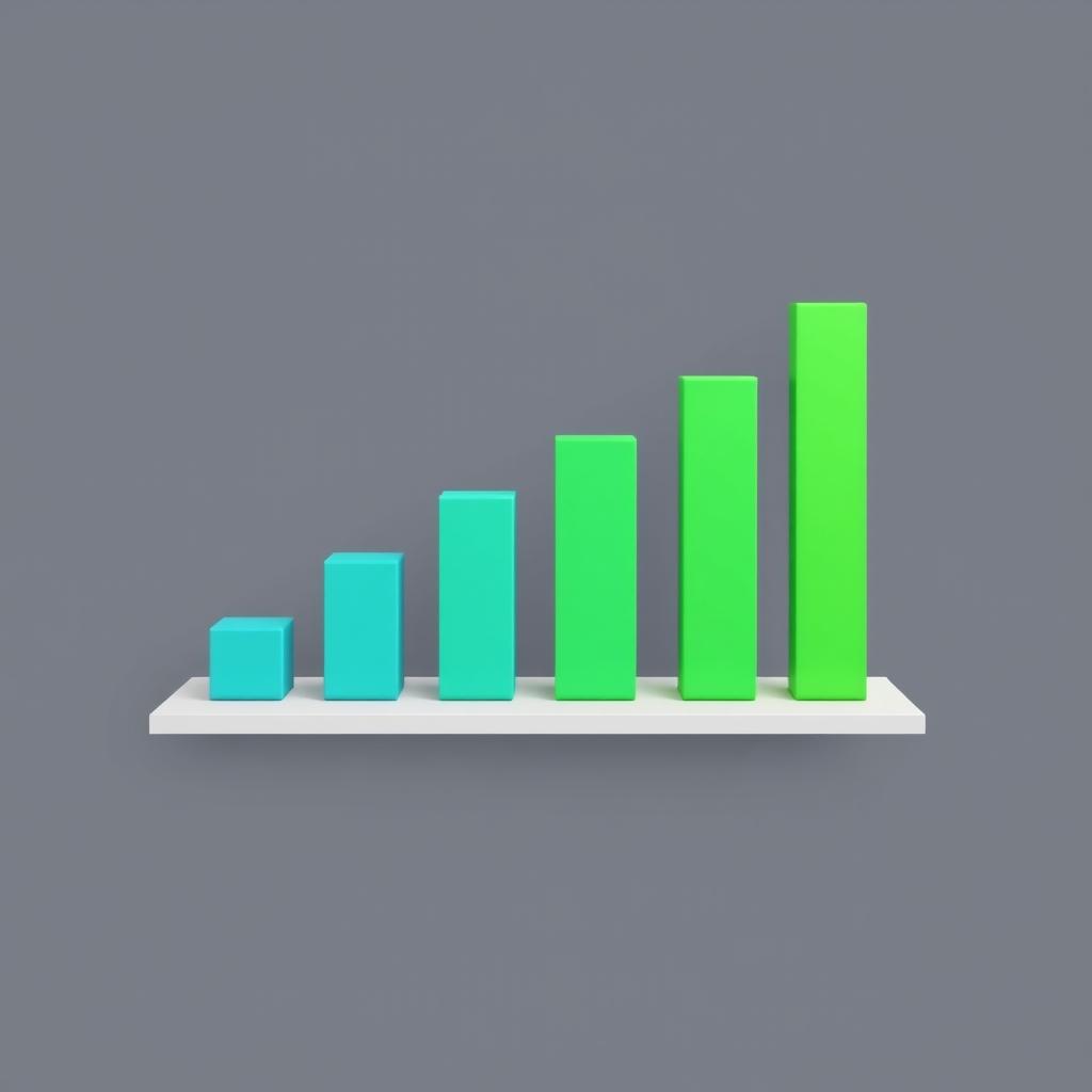 Seven bars on a shelf rise in height: two turquoise, three light green, and two bright green, all set against a gray background
