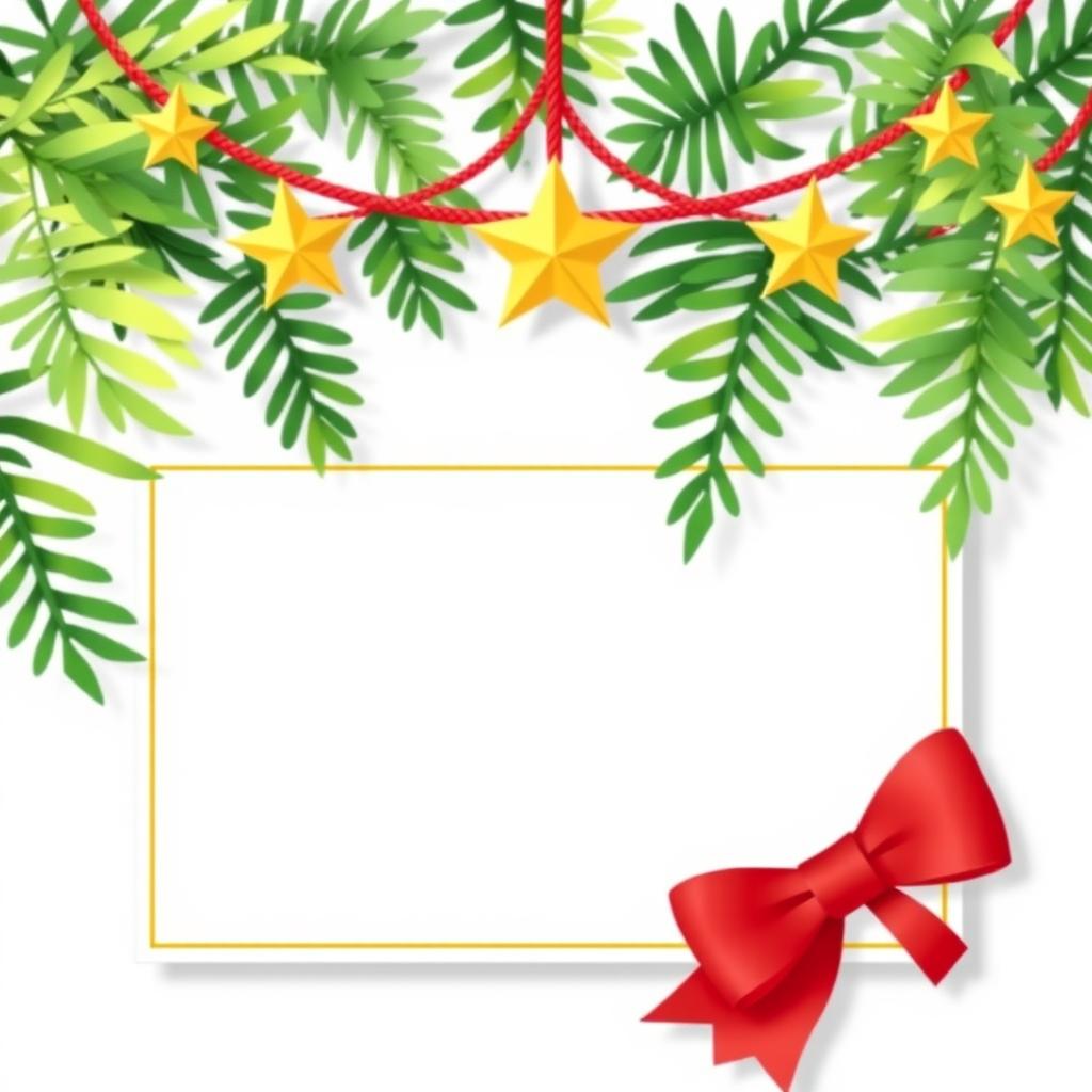A blank card with a gold frame is decorated with green leaves and a red bow. A red string with yellow stars hangs above the card.