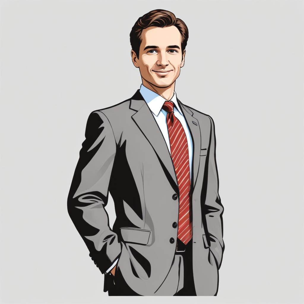 attire, business, businessman, cartoon, corporate, fashion, formal, gray, illustration, man, portrait, professional, red, smiling, standing, striped, style, suit, tie, wear