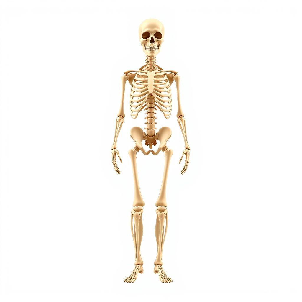 A human skeleton stands against a white background