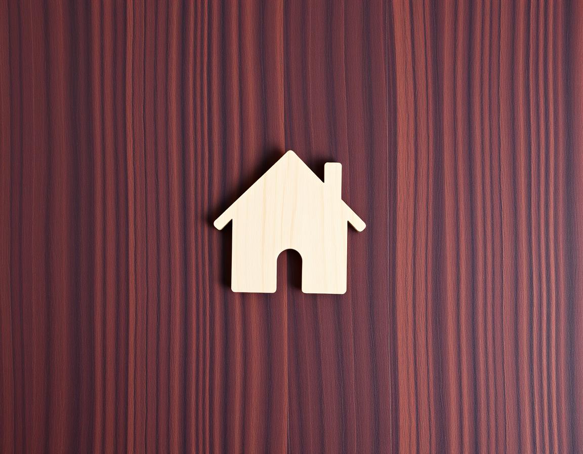 A small, wooden cutout of a house is placed on a brown woodgrain surface.