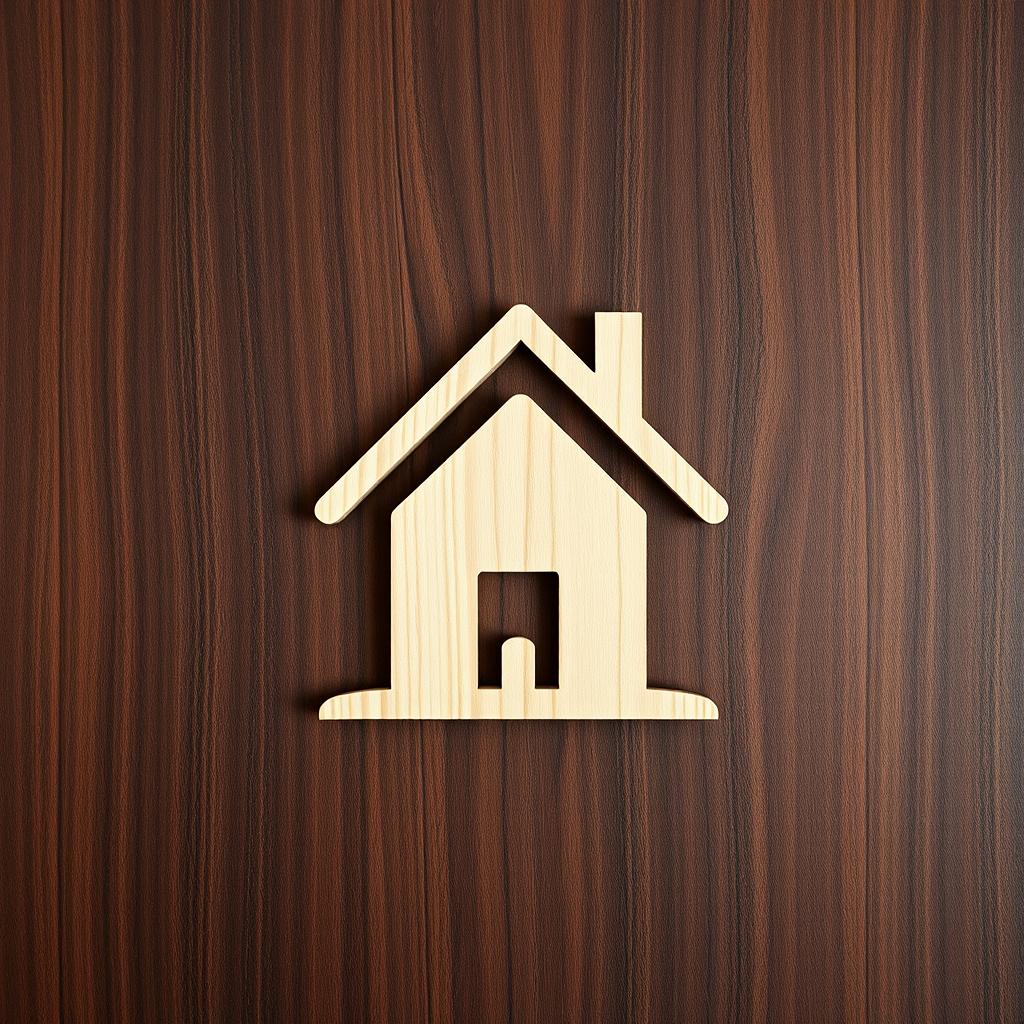 A wooden house icon on a brown surface