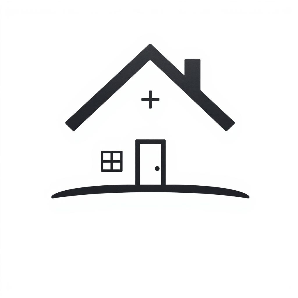 A simple black outline of a house with a roof, chimney, door, window, and a curved line representing the ground.