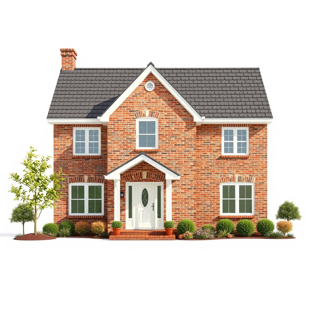 A two-story brick house with a white door, gray roof, multiple windows, and porch, surrounded by small bushes and trees