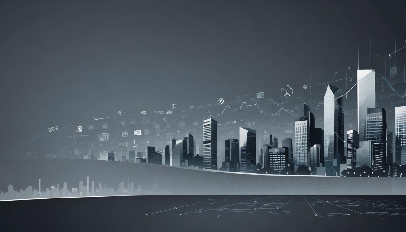 A silhouette of a city skyline with white lines and symbols representing progress, growth, and data.