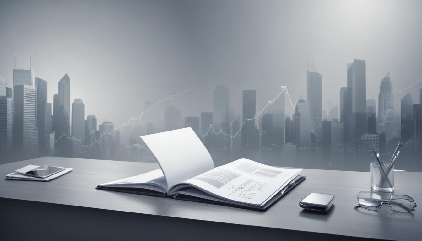 An open book rests on a clean desk, with office supplies and a phone nearby. A city skyline with rising graphs is blurred in the background.